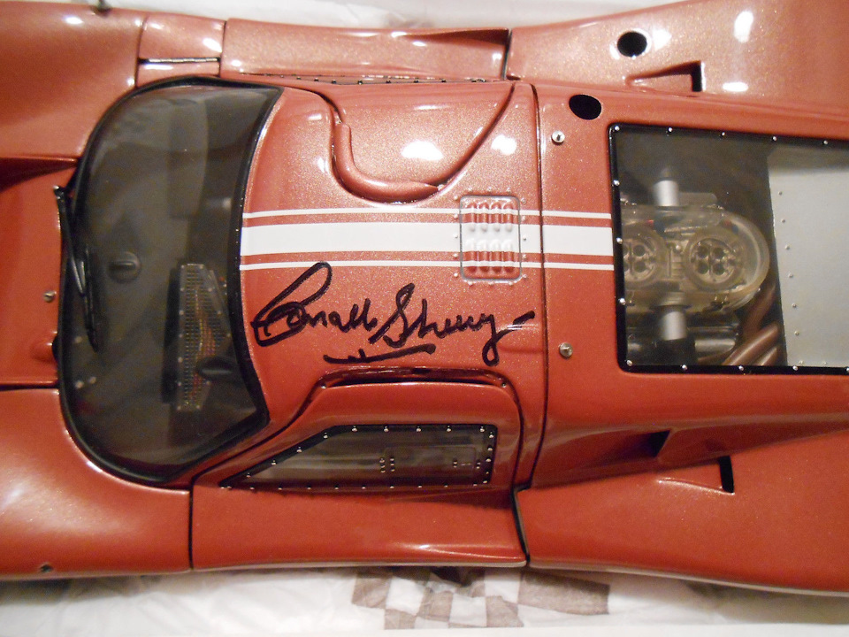 В порыве интереса к Кэрроллу Шелби я заглянул на eBay в поиске моделей в масштабе 1:18 с его подписью. Внезапно, оказалось, что буквально через 2 минуты после выдачи результатов запроса кончаются торги по Ford GT-40 MkIV 1967 года от Exoto, на котором Шелби расписался в апреле 2011 года (меньше, чем за год до своей смерти). Более того, второй сертификат уведомлял, что это 1 из 3 экземпляров “пресс-сэмплов” Exoto, а я с журналистских времен питаю слабость ко всяким предсерийным тестовым образцам и прочим любопытным версиям продуктов. Сам продавец уверял, что это единственный из трех пресс-образцов, подписанный Шелби — что делает модель вообще единственной в своем роде. Наконец, коробка модели с символикой “100 лет Ford Racing” тоже добавляла эксклюзивности в комбинацию. Мощное комбо, как говорят в таких случаях.