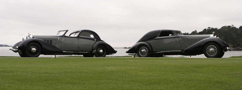 Образец более ранних европейских работ Говарда Даррина: пара Hispano-Suiza (K6 Coupé Chauffeur слева и J12 Coupé de Ville справа), построенные ателье Fernandez et Darrin в 1934 году для Энтони Ротшильда и его жены