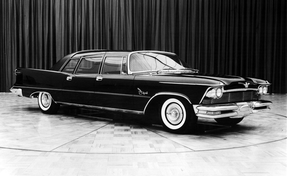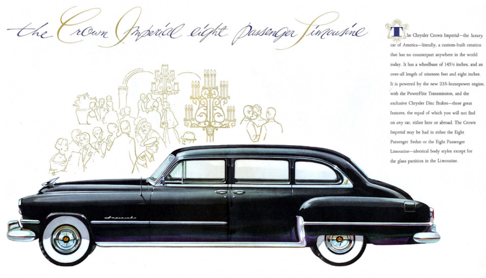 Вплоть до 1955 года Imperial был не отдельной маркой, а флагманской моделью Chrysler. Разумеется, с самого начала выпуска среди разновидностей Chrysler Imperial предлагались и длиннобазные шасси для производства формальных лимузинов, таункаров, парадных фаэтонов и других ныне забытых вариантов кузовов «автомобилей миллионеров» в довоенную пору. С 1940 года появилось название Crown Imperial для обозначения этих, наиболее престижных, версий модели. В то время совокупный спрос на лимузины и прочие Crown Imperial с колесной базой 3.7 метра доходил до 850 экземпляров в год. Когда производство возобновилось после Второй Мировой Войны, в 1946-48 годах было продано еще 750 Crown Imperial Limousine. Затем появилось первое послевоенное поколение Chrysler, продержавшееся на конвейере до 1954 года. В это время и был заметен спад спроса на длиннобазные версии Imperial: с 415 машин в 1950 году до 100 в 1954-м… Кстати, Crown Imperial 1953-54 годов вошел в историю, как самый широкий серийный легковой автомобиль: 2105 мм!