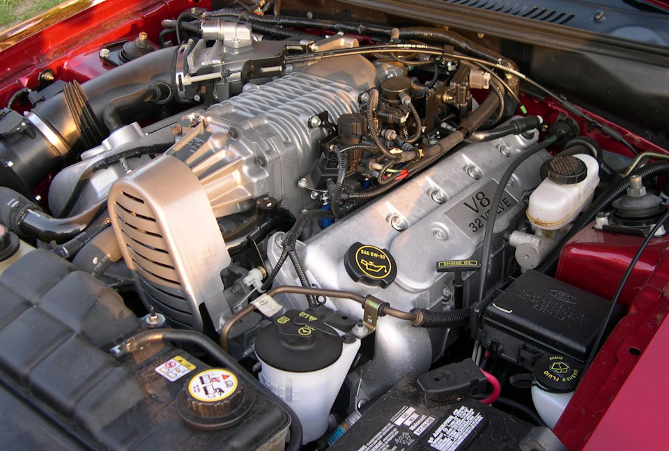 SVT снова пропустили модельный год, но лишь для того, чтобы подготовить Cobra, почти официально прозванную «терминатором». 390 л.с. – именно столько удалось «снять» с 4.6 DOHC, дополнив его компрессором Eaton M112 с интеркулером в развале блока. Практически все детали двигателя модифицировали, чтобы обеспечить надежность при резком росте мощности и момента. Вместо алюминиевого блока использовали чугунный, применили кованые шатуны Manley, болты ARP, кованые поршня… Над головками и характеристиками распредвалов тоже поработали. От Cobra R 2000 года взяли алюминиевый маховик и, наконец-то, 6-ступенчатую МКПП Tremec T-56. Задний мост пришлось усилить распорками и более крепкими полуосями (тоже от Cobra R), заодно главную пару поменяли на 3.55:1. Все эти усилия не прошли даром: по данным Muscle Mustangs & Fast Fords, разгон до 100 км/ч происходил всего за 4,5 секунды, а время прохождения ¼ мили снизилось до впечатляющих 12,67 секунд! Максимальную скорость ограничили электроникой на уровне 250 км/ч.