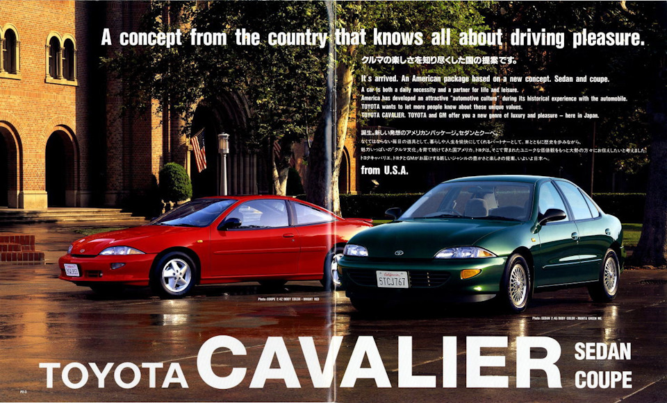 Появлению этой машины способствовали исключительно политические мотивы – стремясь улучшить свое положение в вопросах, связанных с импортом автомобилей в США, Toyota подписали соглашение с General Motors о продаже праворульных седанов и купе Cavalier под своей маркой в Японии. Эти машины выпускались с 1996 по 2000 год в США на том же заводе в Лордстауне, штат Огайо, где и большинство прочих J-body. Разумеется, главными их отличительными особенностями были «японское» расположение руля и эмблемы Toyota, но и в других деталях Toyota Cavalier отличалась от Chevrolet. Все Toyota оснащались 2.4-литровым двигателем Twin Cam (LD9) в паре с 5-ступенчатой автоматической КПП.
