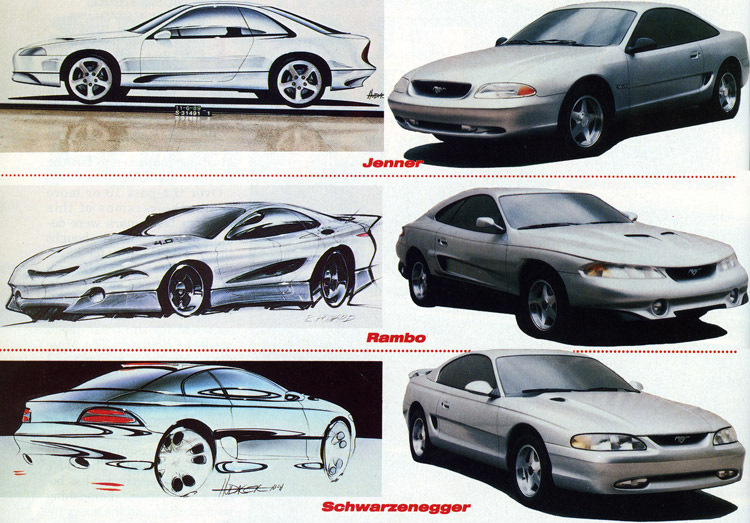 В 1990 году в Ford, разрабатывая дизайн четвертого поколения Ford Mustang, сделали три концепт-кара, которые назвали «Рэмбо», «Арнольд Шварцнеггер» и «Брюс Дженнер» — сообразно уровню их визуальной агрессии. От «Рэмбо» тогда отказались, посчитав его слишком злобным. Похоже, через 20 лет эти чертежи подобрали дизайнеры семейных автомобилей.