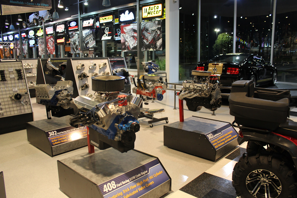 Справа от входа — экспозиция готовых двигателей из ассортимента магазина и редкий Shelby GT-H 2006 года в витрине. В каждом Super Store стоят машины из корпоративной коллекции