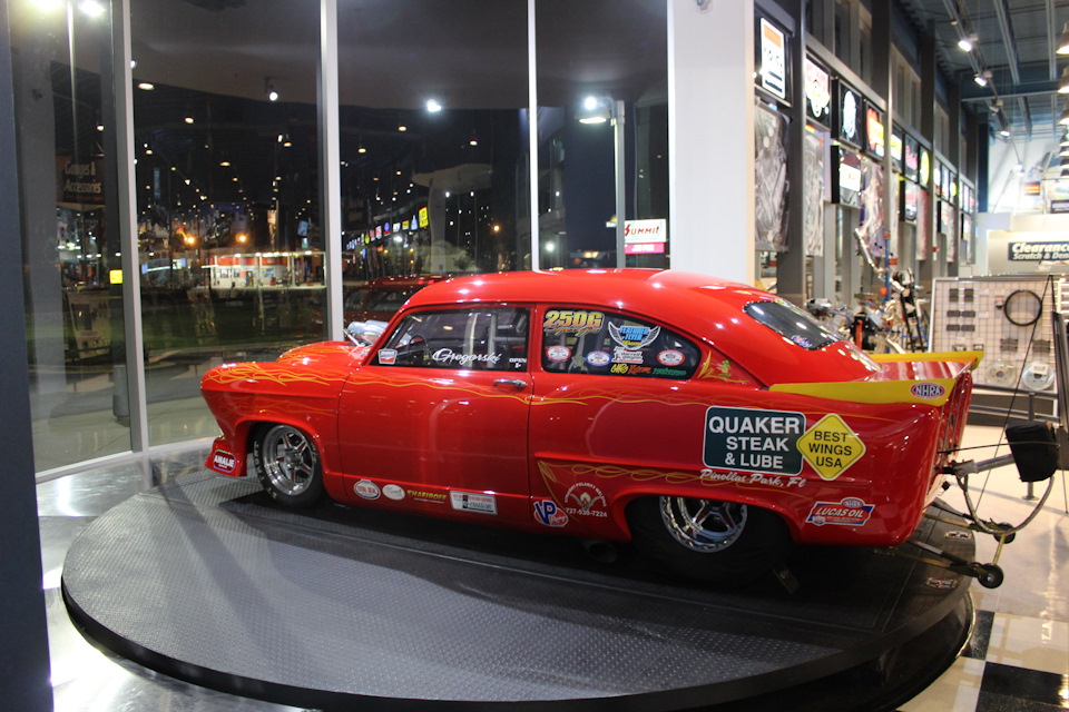 Слева — драгстер на основе компактного Henry J начала 1950-х напоминает о том, что именно драг-рейсинг является главным автоспортивным фокусом Summit Racing, несмотря на интересы и в других видах спорта. Компания владеет собственной трассой, где проводится этап чемпионата NHRA, а спонсируемые Summit Racing пилоты Грег Андерсон и Джейсон Лайн суммарно шесть раз становились чемпионами в престижном классе NHRA Pro Stock