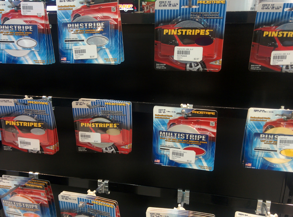 Одно из интересных открытий для меня лично: широкий выбор клеющихся полос для пинстрайпинга. Это популярный элемент на американских машинах вплоть до нашей эры (чем более солидный автомобиль был изначально, тем больше шансов найти на нем хотя бы следы родного пинстрайпа по периметру над дверными ручками), но часто павший в неравной схватке с полировщиками или малярами… Так вот, оказывается, можно просто купить клеющуюся ленту и восстановить пинстрайп практически заводским методом, не прибегая к услугам малочисленных у нас художников-специалистов!