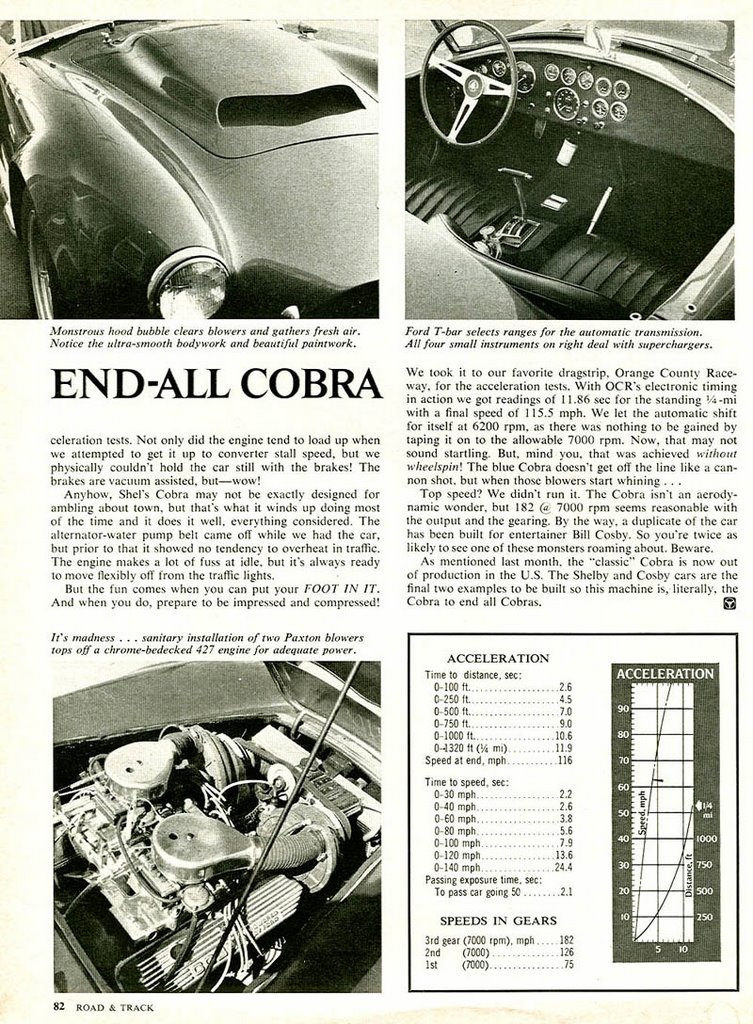 А в февральском номере журнала Road & Track за 1968 год появилось определение, с тех пор приклеившееся к CSX3015 – “The Cobra to end all Cobras” («Кобра, которая положит конец всем Кобрам»). Кстати, журнал провёл собственный тест, в котором автомобиль показал 3,8 секунд разгона до 100 км/ч (заметно хуже, чем заявлялось самим Шелби, но всё равно впечатляюще) и 11,86 секунд на «квотере». Максимальную скорость не замеряли, но предположили 293 км/ч в качестве расчётного показателя для 7000 об/мин при имеющейся главной паре. Заодно, журналисты усомнились и в заявленных 800 л.с., хотя не слишком активно развивали и эту мысль, зато отметили, что указанные показатели на 1/4 мили достигаются без пробуксовки задних колёс — по их словам, автомобиль не слишком быстр при старте с места, но ситуация меняется, когда компрессоры начинают нагнетать воздух с ростом оборотов!