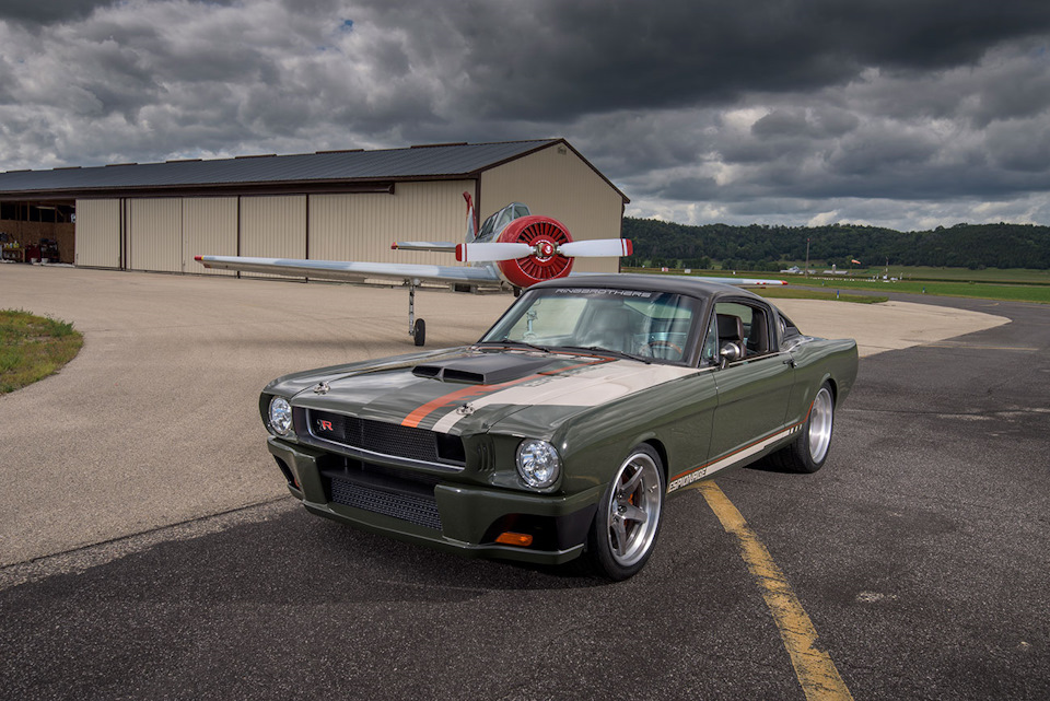 При взгляде издалека может показаться, что этот зеленый Ford Mustang 1965 года — обычный рестомод. Разумеется, более тщательный осмотр даже снаружи выявит все традиционные детали, отличающие творения братьев Ринг от более простых проектов. Но, на самом деле, под краской BASF «Spy Green» скрывается надетый на шасси от Detroit Speed полностью кастомный кузов из углепластика! Причем, Ringbrothers сделали его на 10 см шире оригинального, чтобы гармонично вписать в конструкцию очень широкие колеса — 295/35ZR18 спереди и 345/30ZR19 сзади. При мощности 959 л.с., которую Wegner Motorsports сняли с компрессорного LS7, такая ширина весьма уместна! После этого уже как-то неуместно объяснять, что интерьер машины тоже пришлось делать с нуля, лишь вдохновляясь оригиналом. Любопытно, что вместо обычной панели приборов в Espionage поставили, в очередной раз, гоночную Racepak, но нестандартно разместив её прямо по середине торпедо.