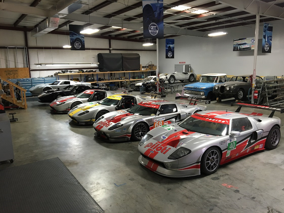 Весь автопарк Robertson Racing, включая запасную машину, запасные кузова и дорожный Ford GT, оформленный аналогично гоночным