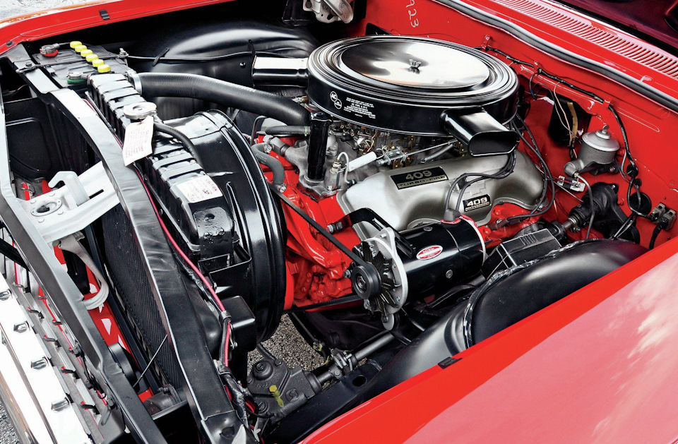 409. «She’s real fine, my 409», пели Beach Boys в своем хите 1962 года, так и названном «409″ в честь двигателя Chevrolet. Песня прославила и группу, и мотор, появившийся годом ранее в качестве флагманского для Impala, Bel Air и Biscayne. Конструктивно аналогичный «348», новый двигатель имел больший диаметр цилиндра (4,312″) и ход поршня (3,5″), что дало объем 409 cui или 6,7 литра. По сравнению с «348», поменялись поршни (кованые вместо литых), использовались подшипники из нового материала «Moraine 500» и были усилены детали ГРМ. Даже в самой слабой конфигурации «409» имел 340 л.с., а в самой мощной заявлялось 425. Именно этот двигатель сделал популярными первые Chevrolet Impala SS до начала гонки мощностей мускул-каров 1960-х. Несмотря на сложности в тюнинге по сравнению со смолл-блоками, «409» за первую пару лет отлично проявили себя в дрэг-рейсинге и даже NASCAR, хотя для самых приближенных к Chevrolet команд предназначались особенные моторы.