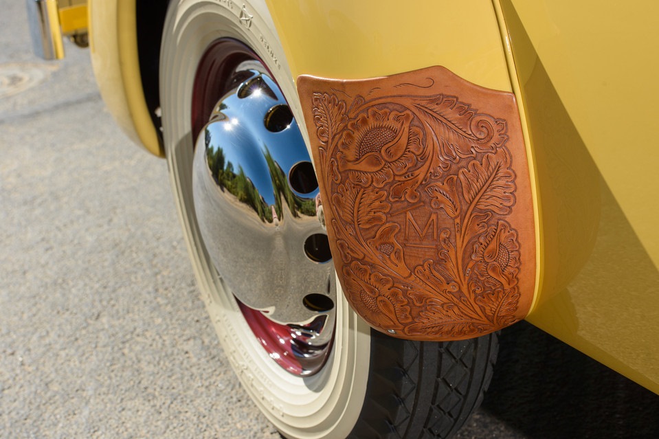 Шоумен Микс приложил много усилий, чтобы его Cord был особенно заметен на дороге: фара-искатель Trippe, клыки бампера, флагштоки с личными флагами, инициалы ТМ на боковых решетках, именные рамки номеров, фамилия и символ ранчо актера на руле, специальная педаль газа для ковбойских сапог… Странные медальоны на капоте — подарок от короля Дании. Кстати, наружное запасное колесо на багажнике (позже такую конструкцию начнут называть continental kit) было установлено заводом всего на 3 экземпляра Cord 812 — все три проданные знаменитостям.