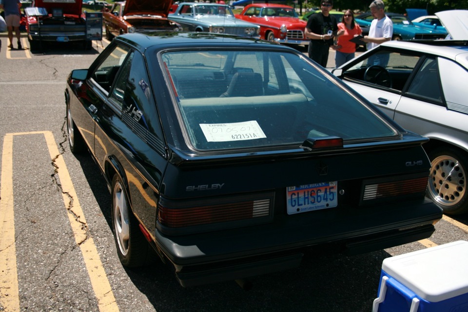 Как и раньше, Shelby GLHS 1987 года предлагался только в одном цвете – черном, дополненном серебристыми наклейками по всему кузову (но без полосы на капоте, крыше и багажнике), включая название модели огромным шрифтом на задних стойках крыши. Все машины поставлялись абсолютно идентично оснащенными: серый салон, люк в крыше, стереосистема с кассетным магнитофоном, центральная консоль без подлокотника, обогреватель заднего стекла, кондиционер, выхлопная система из нержавеющей стали… Одной интересной особенностью стало отсутствие решетки на заднем окне, стандартной для Dodge Shelby Charger. Никаких опций Shelby по-прежнему не предлагали. Кстати, название Dodge нигде не упоминалось на этих GLHS, хотя годом ранее Шелби сохранил имя этой марки на багажнике своих машин.