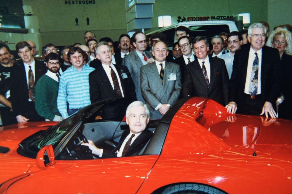 Первый серийный Viper. За рулем — Боб Лутц, в сером костюме по центру — Кастэн, справа от него — Гейл и Шелби
